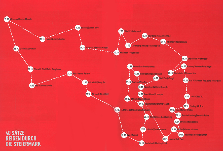 Artists: Baodo, Wolfgang Becksteiner, Helwig Brunner, Günther Eichberger, Manfred Erjautz, Olga Flor, Sonja Gangl, Petra Ganglbauer, Peter Glaser, G.R.A.M., Mathias Grilj, Karl Grünling, Michael Gumhold, Sonja Harter, Wilhelm Hengstler, Klub Zwei, Karin Lernbeiss, Flora Neuwirth, Christian Marczik, Christoph Perl, Georg Petz, Birgit Pölzl, Wolfgang Pollanz, Werner Reiterer, Angelika Reitzer, Oliver Ressler, Sophie Reyer, Valentin Ruhry, Werner Schandor, Irmi Schaumberger, Stefan Schmitzer, Helmut Schranz, Clemens Setz, Dieter Sperl, Andrea Stift, Lea Titz, Andreas Unterweger, Markus Wilfling, Zweintopf (all AT)