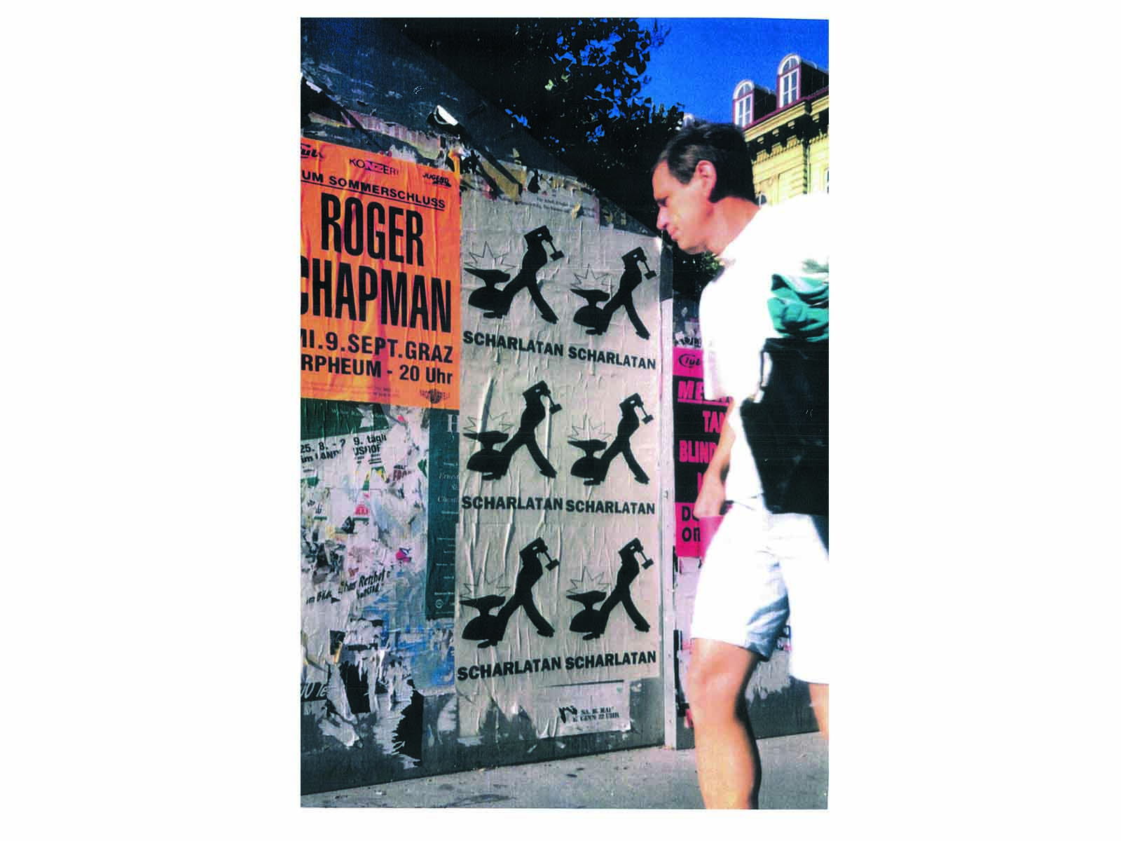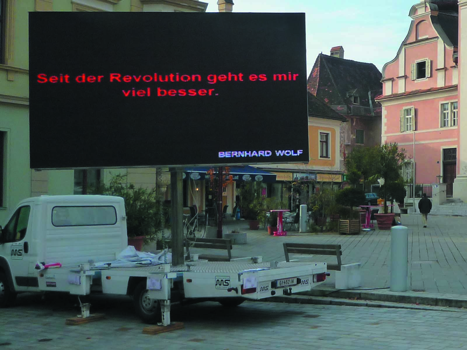 „Bernhard Wolf beschäftigt sich wie seine Plakatprojekte seit 1993 belegen, seit Jahren mit einer bestimmten Klasse öffentlicher Zeichen, die wir Ikonen der Reklame nennen können.“